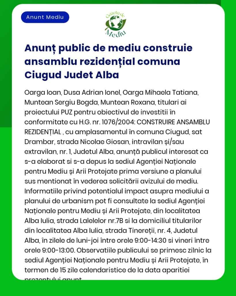 Anunț public de mediu construie ansamblu rezidențial comuna Ciugud Judet Alba