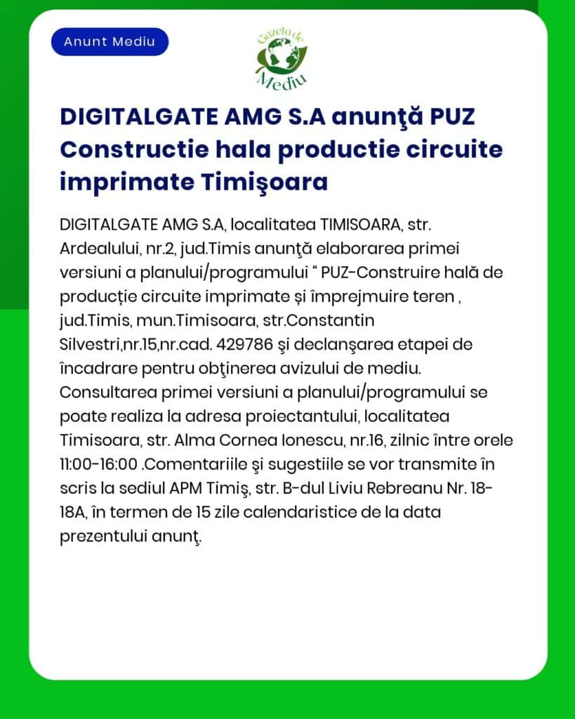 DIGITALGATE AMG S.A anunţă PUZ Constructie hala productie circuite imprimate Timişoara