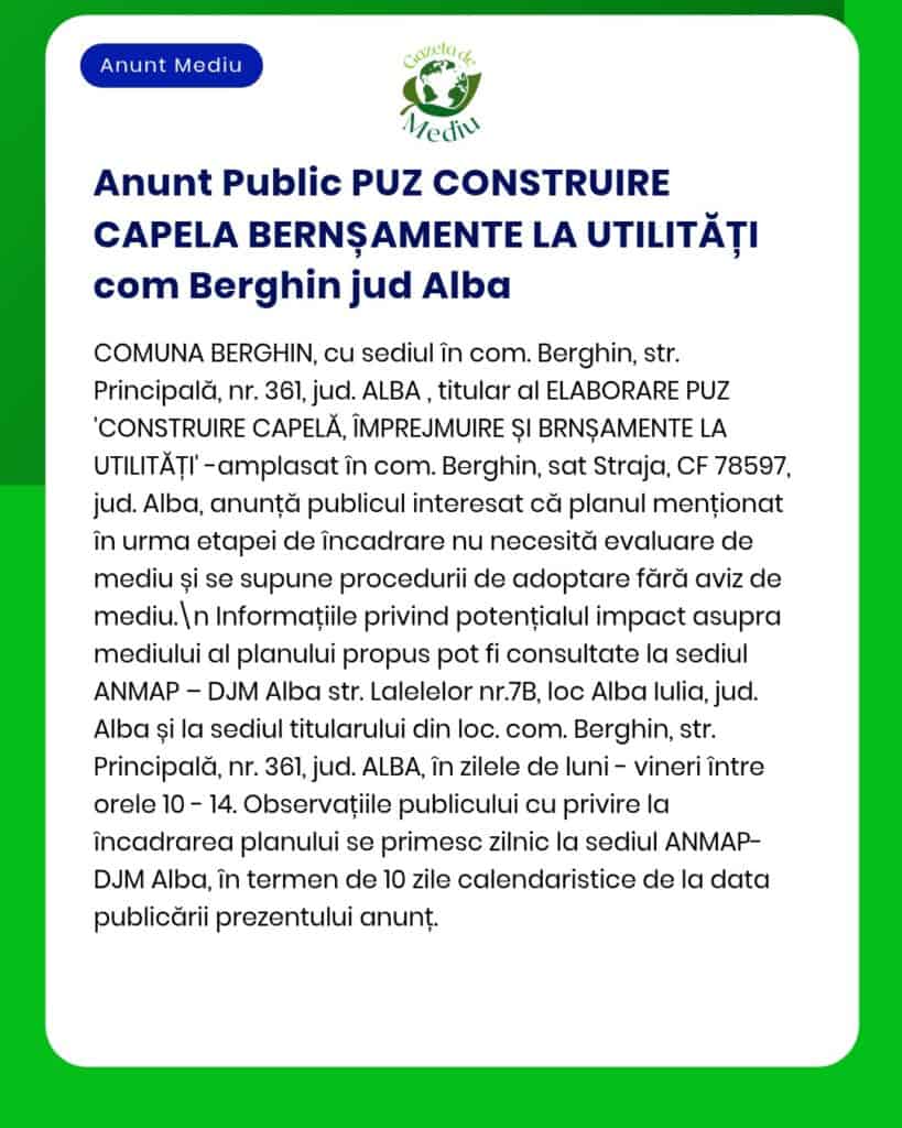 COMUNA BERGHIN anunță elaborarea PUZ pentru construcția unei capele în satul Straja. Planul nu necesită evaluare de mediu și se adoptă fără aviz. Informații disponibile la ANMAP DJM Alba și sediul titularului. Observații se primesc zilnic timp de 10 zile de la publicare.