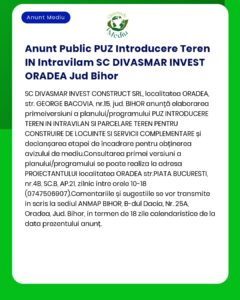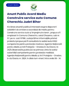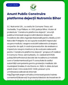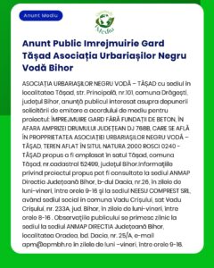 Danut Mariscas Ioan anunță depunerea solicitării pentru acordul de mediu pentru proiectul Sprijin pentru investiții în noi suprafețe de păduri PNRR în comuna Tinca, județul Bihor. Informațiile sunt disponibile la sediul ANMAP și la sediul solicitantului. Observațiile publicului se primesc la sediul agenției.